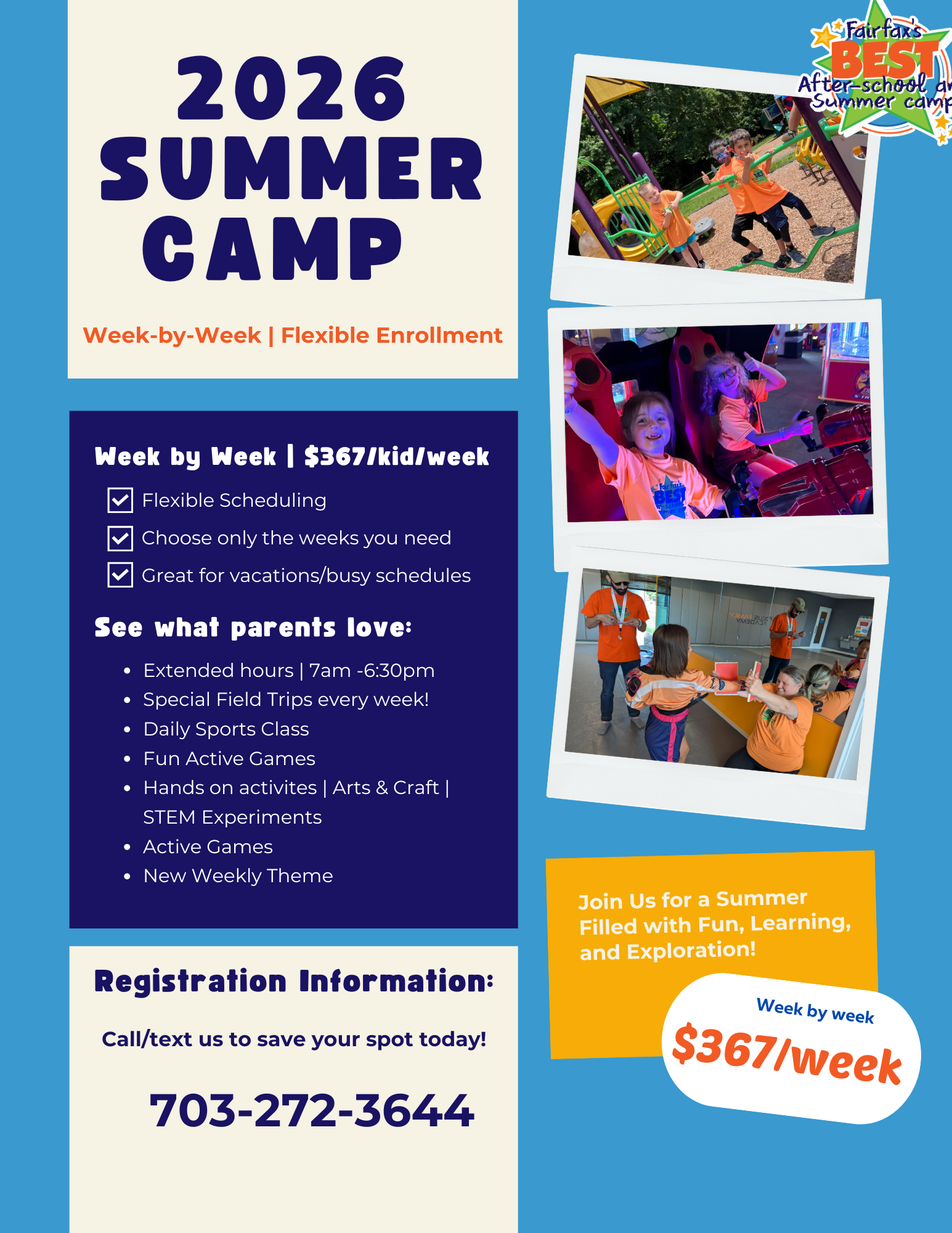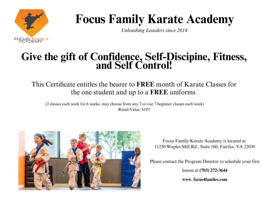 At Focus Family Academy, we help kids & parents grow stronger, more confident, and more focused through exciting karate classes designed with families in mind. Our experienced instructors create a positive environment where students learn self-defense, discipline, and leadership while having fun.\r\n\r\nWe’re also home to Fairfax’s Best Summer Camp, fun & creative activities for kids all summer long. Each week is packed with special field trips, arts & crafts, daily sports classes, STEM experiments and a new weekly theme every week. Whether you are with us for a week or the whole summer, your kids will have blast!